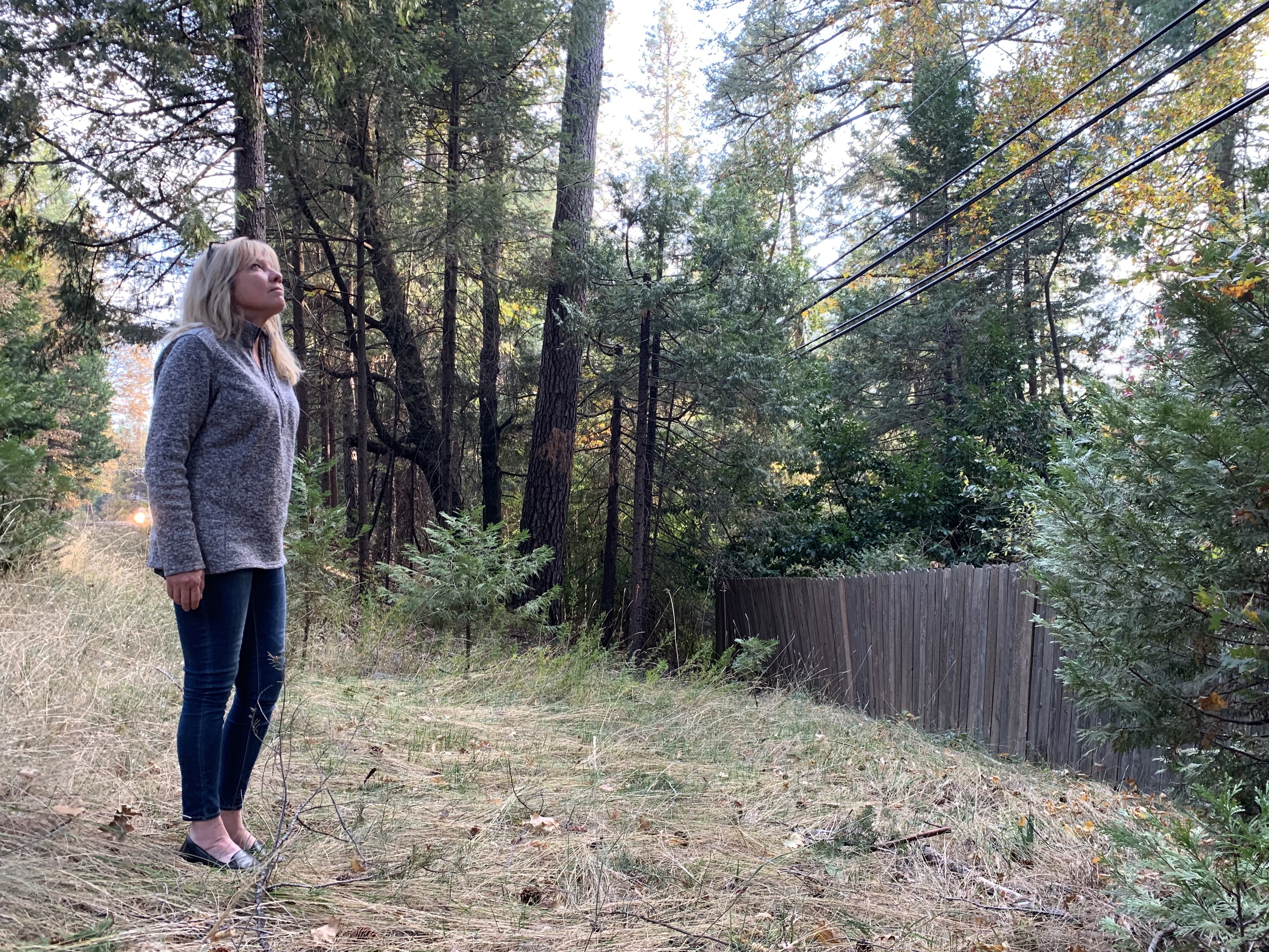 Near her neighborhood one afternoon, she pointed up to power lines still mingling low among dense stands of trees and branches. Folks here recently had their power shut off for six days amid the bankrupt utility PG&E’s new controversial safety plan.