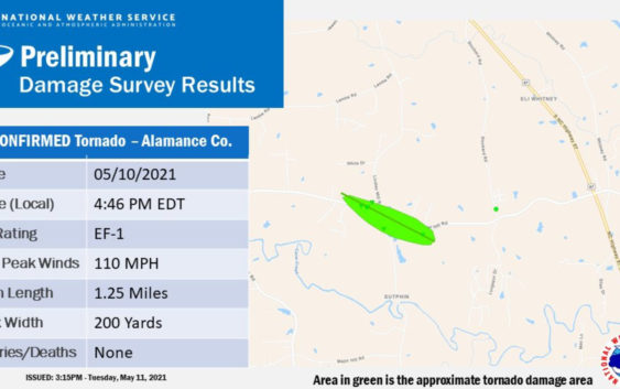 ELI WHITNEY, N.C. (WTVD) — Monday’s severe weather that moved through central North Carolina produced a tornado in Alamance County, the National Weather Service said Tuesday.